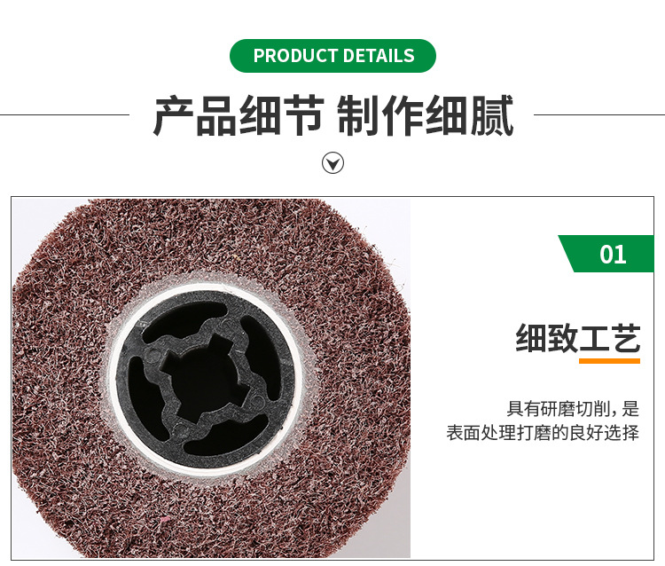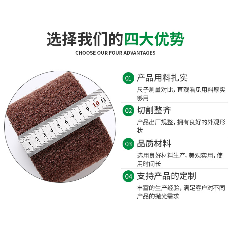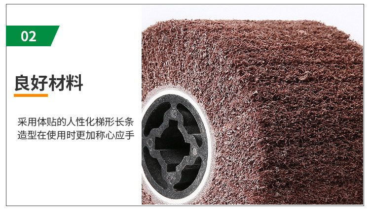 適于要求精密且細致的工作,研磨滑順不產生高壓而留下黑斑,減少瑕疵,不改變工件原重量,對于不銹鋼、鈦合金等材料都能發揮好的效果。拋磨后的光亮度,很迎合外商對于產品亮度的要求。 *產品優點: 1、A級輪采用新配方具有研磨力更強,拉絲更干凈、更快速,絲路更清晰,對鋅合金、鍍鉻等質地較硬的工件的表現。 2、一次完成清潔、毛刺、拋光和裝飾紋處理的工作,可研磨出細致的砂紋,而且使金屬表面更細,更亮. 3、耐磨性高:砂與絲脫落性一致,無堵塞現象,與同類產品相比耐磨性增加20%左右。 4、由于纖維上的礦砂分布均勻,效果均衡、光滑、美觀,且研磨后光潔度佳。 *主要應用市場: 1、不銹鋼產品的表面處理拋光(如保溫杯、餐具、刀具、高爾夫球球頭等) 2、建筑小五金拋光(鎖具、門把手等) 3、工具類、機器零部件(不銹鋼鋼管、傳動軸、各種機械零件、零件槽體等) 注:圖片僅供參考,產品以實物為準。 規格:200mm*50mm*9PA 粒度:80#-320#(400#—1200#價格另報)