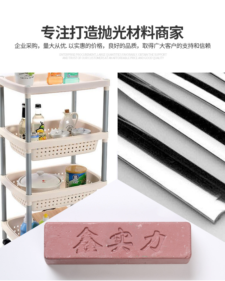 其內(nèi)含豐富有的油脂,因選材講究,更具有超卓的光澤度及切削力,具有相當(dāng)不錯(cuò)拋光效果,拋后紋路光滑細(xì)膩。不會燒傷工件,一般配合粗布輪粗拋使用,價(jià)格比較實(shí)惠。